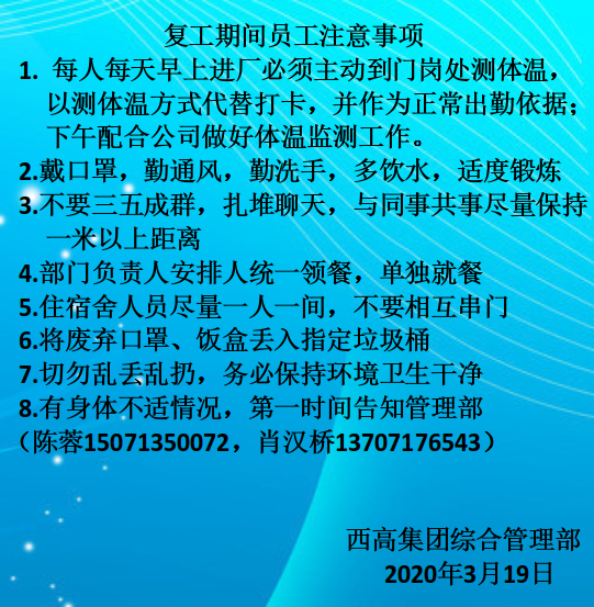 為深入貫徹落實總書記關(guān)于堅決打贏疫情防控阻擊戰(zhàn)的重要指示精神,全面落實黨中央、國務院和省委、省政府、漢陽區(qū)政府關(guān)于疫情防控工作的決策部署,切實做好疫情防控期間企業(yè)復工復產(chǎn)工作,在中共武漢西高電器有限公司支部委員會書記周雄同志的帶領下, 武漢西高電器有限公司主要從以下幾方面開展防控工作: